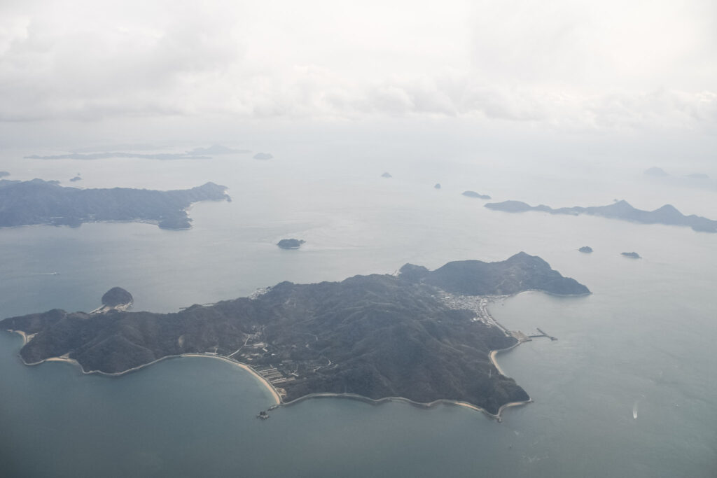 大阪まで来ると松山は目と鼻の先、暫くすると777は降下を初めて再び雲に突っ込みました。厚い雲ではありましたが、終始マイルドな揺れで雲を通過すると、瀬戸内海の島々が姿を現しました。