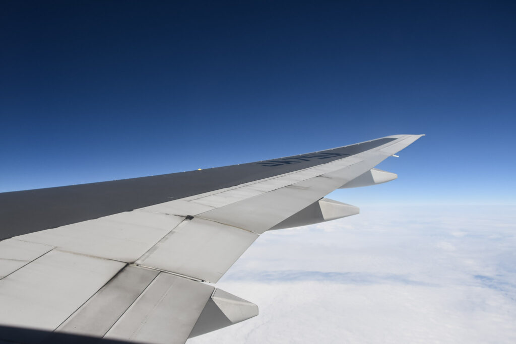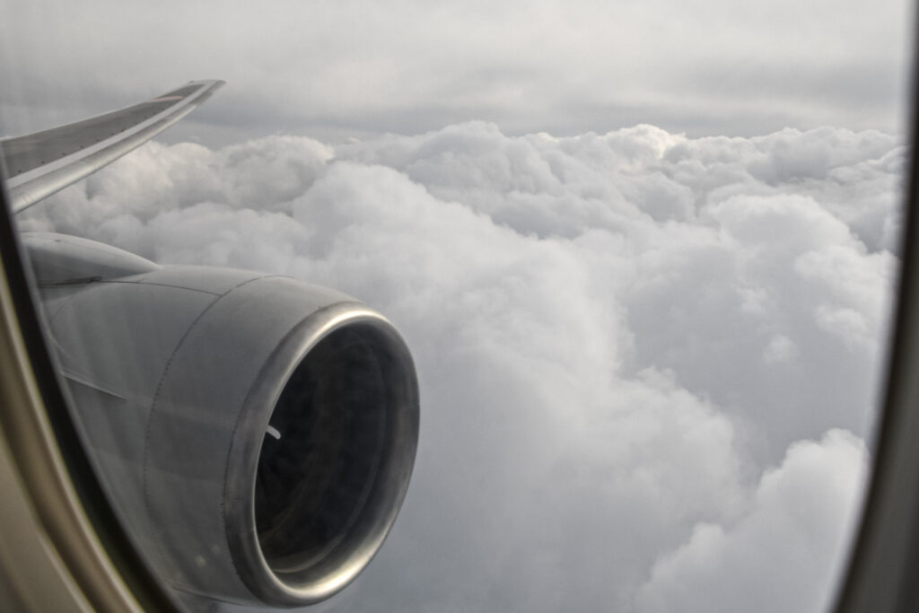 曇天の羽田空港を離陸すると雲を突っ切り一路西へ。エンジンよりも前方の席をアサインしたため、エンジン音が綺麗に聞こえます。飛行機のおススメの席はどこか?と聞かれることがありますが、エンジン音を心行くまで楽しみたいという方は、エンジンよりも前の席がマストです。