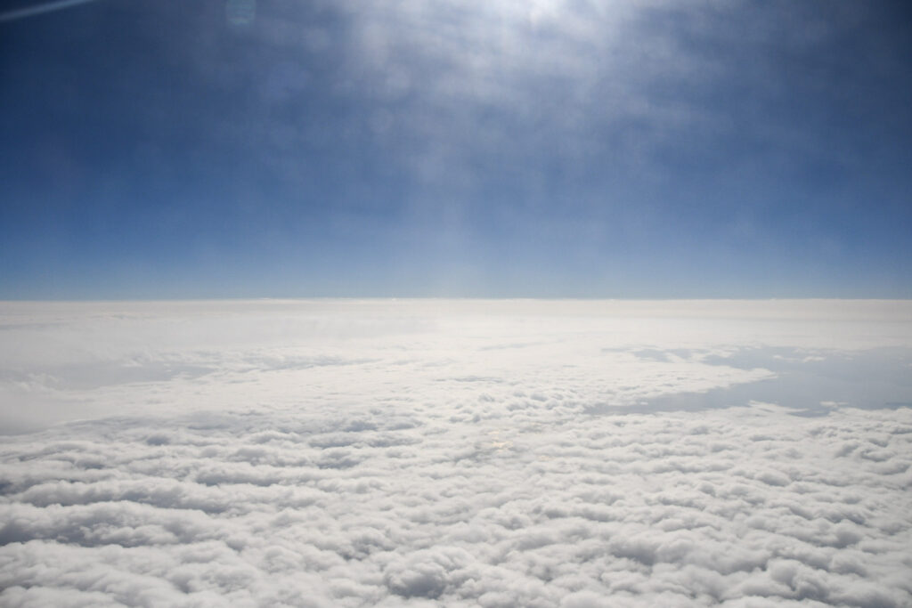 今回は訳あって進行方向左側の席をとりましたが、真昼間の南向きの席は直射日光が眩しいです。それに加えてこの日は、下界が雲しかありませんでした。大多数の方はシェードを下げてしまうような状況ですが、窓を見ていると何かに気づくものです。