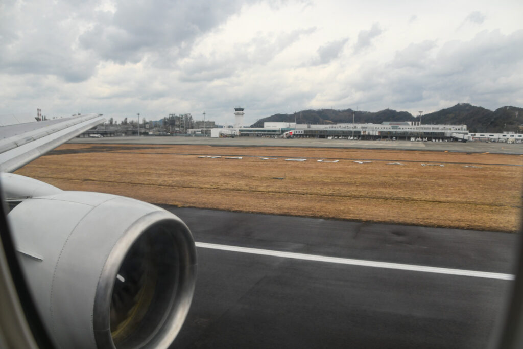 その反対方向からの着陸をするとなると、進行方向左手からは、大都会松山の街並みを楽しめるのではと、今回こちら側の席をアサインしたのですが、天気を味方につけることはできず、海側から進入し、そのまままっすぐRWY14へ着陸しました。