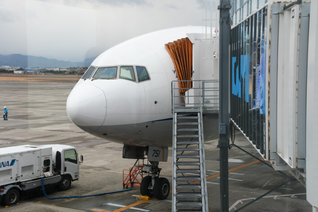 この日の589便の機材は、国内線で最大のキャパシティを誇る777-300。スケジュール上では、787-8がアサインされていましたが、当日機材変更で大幅タイプアップと相成りました。